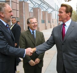 Bildunterschrift: v.l.: Minister Dr. Axel Horstmann, der kalifornische Beauftragte für Klimaschutz Dr. Alan Lloyd und Gouverneur Arnold Schwarzenegger begrüßen sich vor dem Klimaschutzministerium in Sacramento