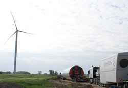 Bildunterschrift: Transport des Maschinenhauses der K82 2.0MW und der Turmsegmente. Im Hintergrund die Kenersys K100 2.5MW
