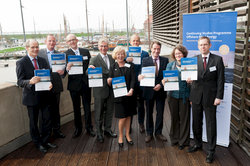 Staatsrat Hon.-Prof. Matthias Stauch (Der Senator für Wirtschaft, Arbeit und Häfen des Landes Bremen), Nils Schnorrenberger (GF Bremerhavener Gesellschaft für Investitionsförderung und Stadtentwicklung - BIS), Ronny Meyer (GF Windenergie-Agentur WAB), Roland Hentschel (Wirtschaftsförderung der Stadt Oldenburg), MinDirigt´in Ulla Ihnen (Niedersächsisches Umweltministerium), Dr. Joachim Peters (Metropolregion Bremen-Oldenburg im Nordwesten e.V.), Prof. Dr. Bernd Siebenhühner (Vizepräsident Carl von Ossietzky Universität Oldenburg), Dr. Juliane Reichel (Projektleiterin ForWind), Dr. Stephan Barth (GF ForWind), Foto: Thorsten Helmerichs.