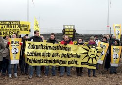 Wegen der radikalen Kürzungspläne bei der Solarstromförderung, die Bundeswirtschaftsminister Philipp Rösler und Umweltminister Norbert Röttgen heute vorstellen werden, hatte der Bundesverband Solarwirtschaft (BSW) zu einem bundesweiten Aktions- und Protesttag aufgerufen. In Rheinland-Pfalz solidarisierten sich die Mitarbeiter der juwi-Gruppe deshalb mit den Kollegen von First Solar aus Mainz und von der Bauer Solartechnik GmbH, Selzen. Zusammen stellten sich die nahezu 1.000 Beschäftigten aus dem Bereich der erneuerbaren Energien trotz Nebels und Nieselregens schützend vor den juwi-Solarpark in Wörrstadt und formulierten mit Sätzen wie: "Heute keinen Sonnenstrom – morgen wieder das Atom?" lautstark ihren Unmut.
