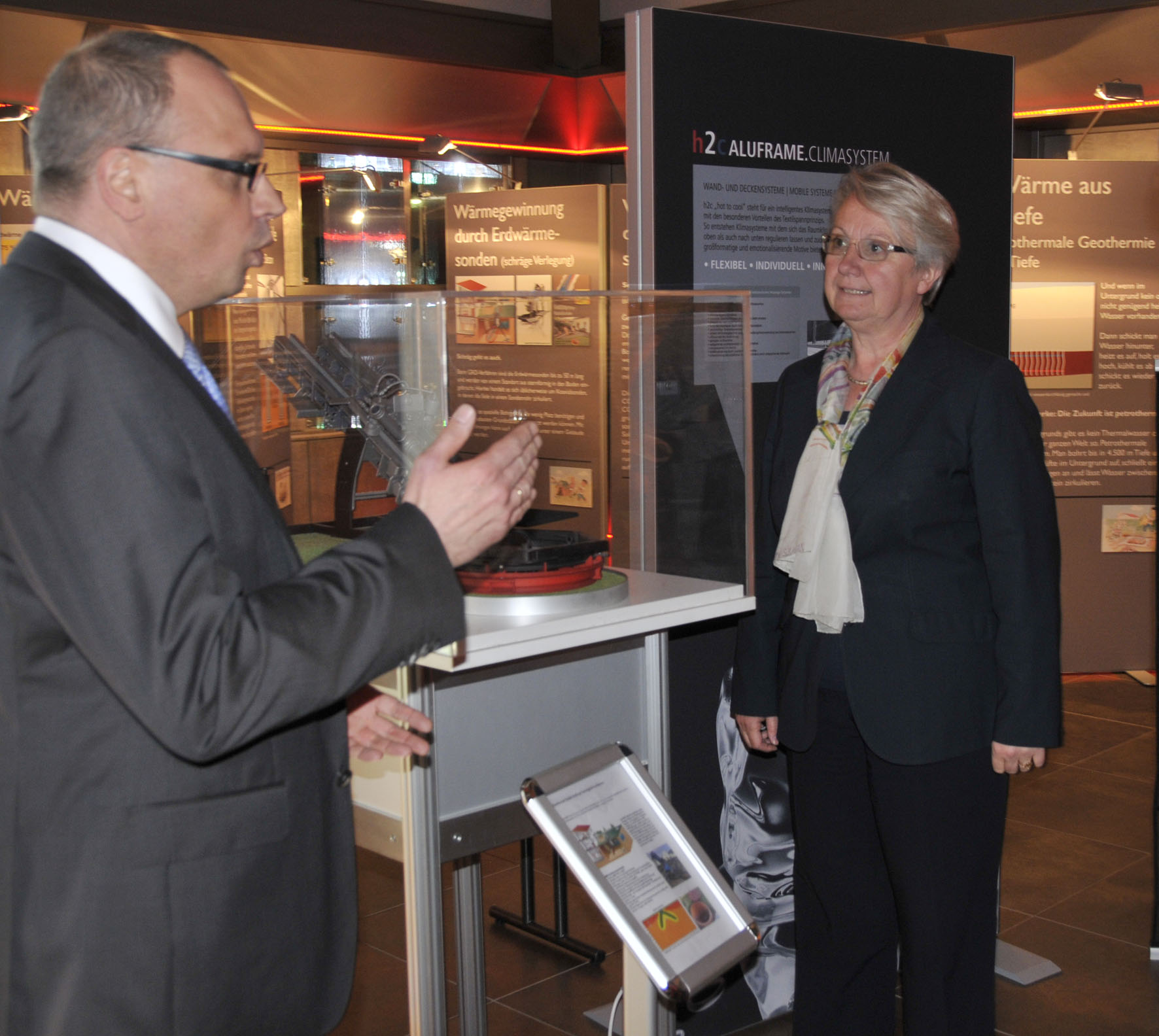 Die Bundesministerin für Bildung und Forschung Annette Schavan lässt sich die Wanderausstellung ausführlich erklären