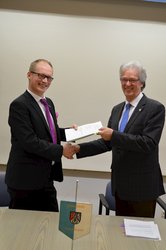 Weiskirchen/Wörrstadt (iwr-pressedienst) - Das schönste Weihnachtsgeschenk haben sie sich schon selbst gemacht: Drei Tage vor Heiligabend besiegelten die saarländische Gemeinde Weiskirchen und die rheinhessische juwi-Gruppe den Bau eines modernen Windparks. Auf dem Schimmelkopf, in Sichtweite des Rathauses, wo der Gestattungsvertrag, eine Andienungsvereinbarung und ein städtebaulicher Vertrag unterzeichnet wurden, sollen bis 2014 vier leistungsstarke Windenergie-Anlagen des Typs Enercon E-126 errichtet werden. Zusammen mit drei Anlagen desselben Typs, die juwi auf der Gemarkung der rheinland-pfälzischen Nachbargemeinde Waldweiler plant, wird im Schwarzwälder Hochwald einer der ersten länderübergreifenden Windparks entstehen. Mit einem Jahresertrag von 130 Millionen Kilowattstunden leistet er einen wichtigen Beitrag zur Energiewende.
