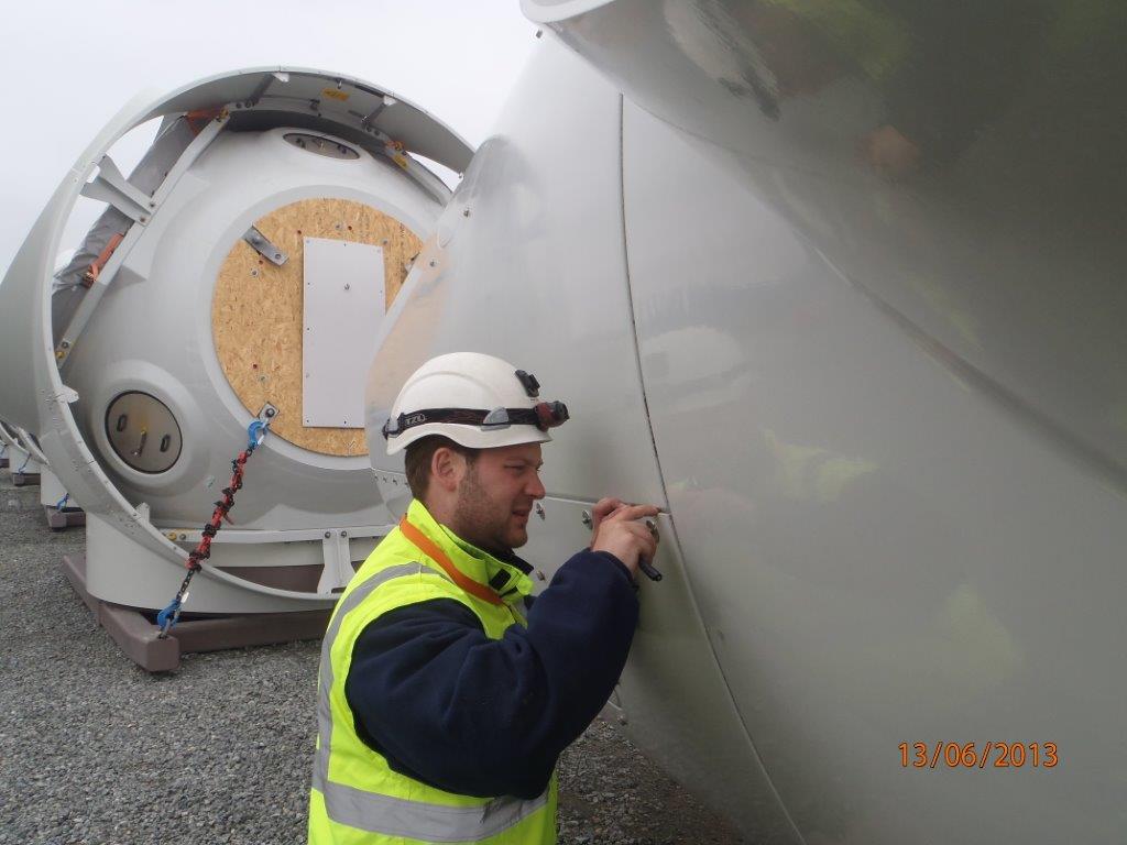 Bildunterschrift: Kontrolle der Nabe durch die Deutsche Windtechnik im Rahmen der Bauüberwachung für den Windpark DanTysk.