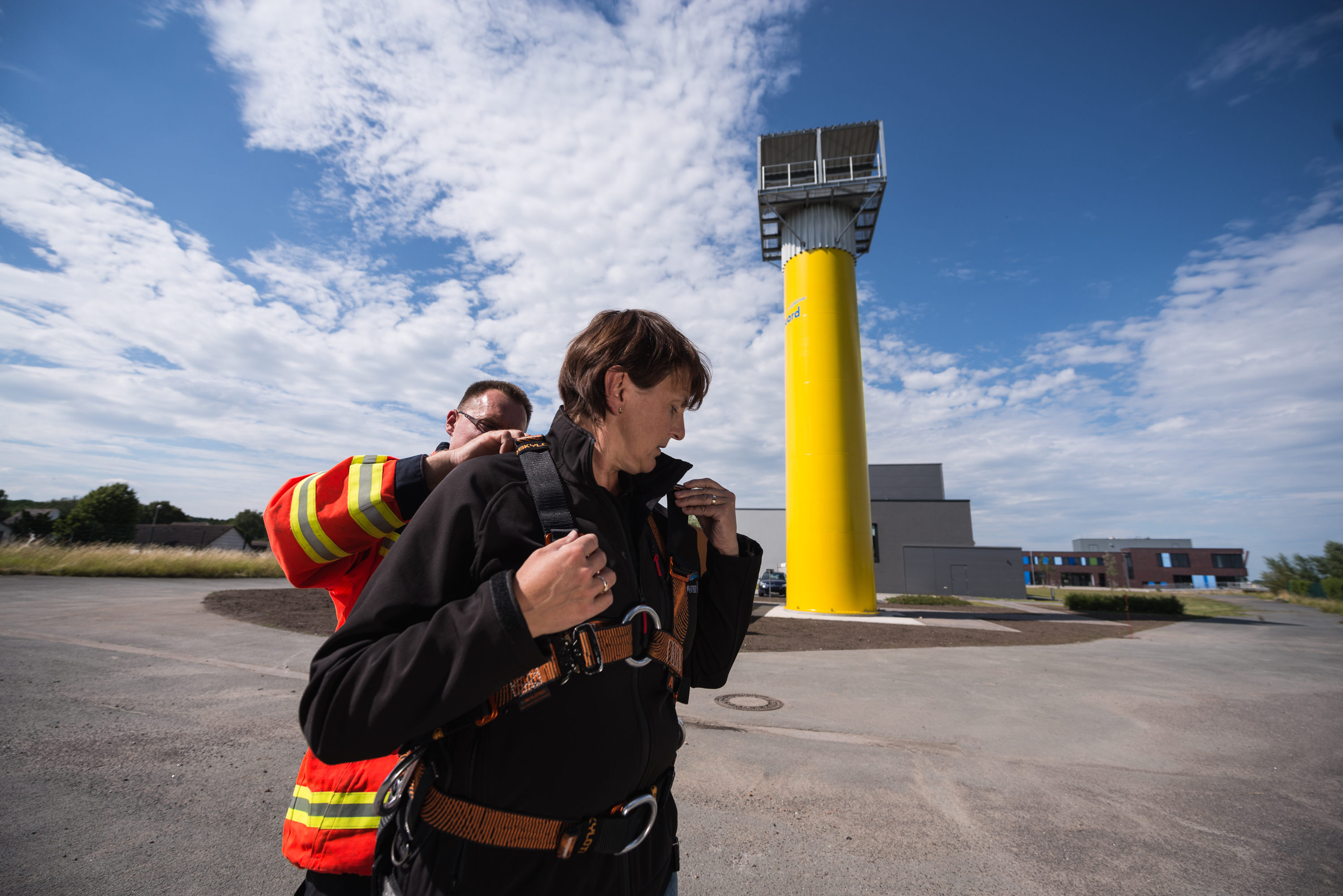Das Herzstück der neuen Trainingseinrichtung, die die beiden Partner zukünftig gemeinsam nutzen werden, ist ein 19 m hohes, signalgelbes Turmsegment einer Windkraftanlage. Verankert ist es auf einem 30 m² großen Fundament, das auf 20 m langen Pfählen steht. Mit verschiedenen Trainingsmöglichkeiten an Steigleitern und Drahtseilsystemen, können alle Anforderungen an die Kletterausbildung nach deutschen und internationalen Anforderungen erfüllt werden. Rettungsübungen im Turm und kundenspezifische Lösungen an und auf der überdachten Plattform auf dem Turm, bieten weitere Optionen für Höhenrettungs- und Abseilübungen.