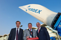 Hamburg (iwr-pressedienst) - Die Nordex SE stellt zur WindEnergy Hamburg, die vom 23. bis 26. September 2014 in Hamburg stattfindet, die Turbinen vom Typ N100/3300, N117/3000 und N131/3000 der Generation Delta in den Mittelpunkt ihres Messeauftritts. Besondere Attraktion ist das 64,4 Meter lange Rotorblatt der Binnenlandturbine N131/3000 – eines der längsten Rotorblätter für Onshore-Anlagen – das erstmals zur Messe als Exponat der Öffentlichkeit präsentiert wird.