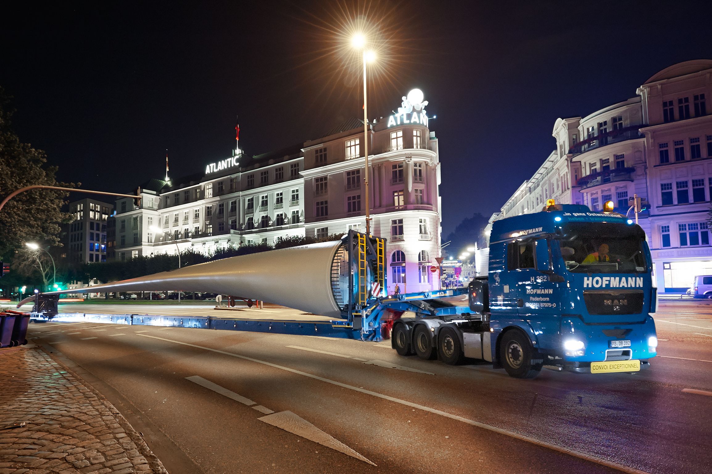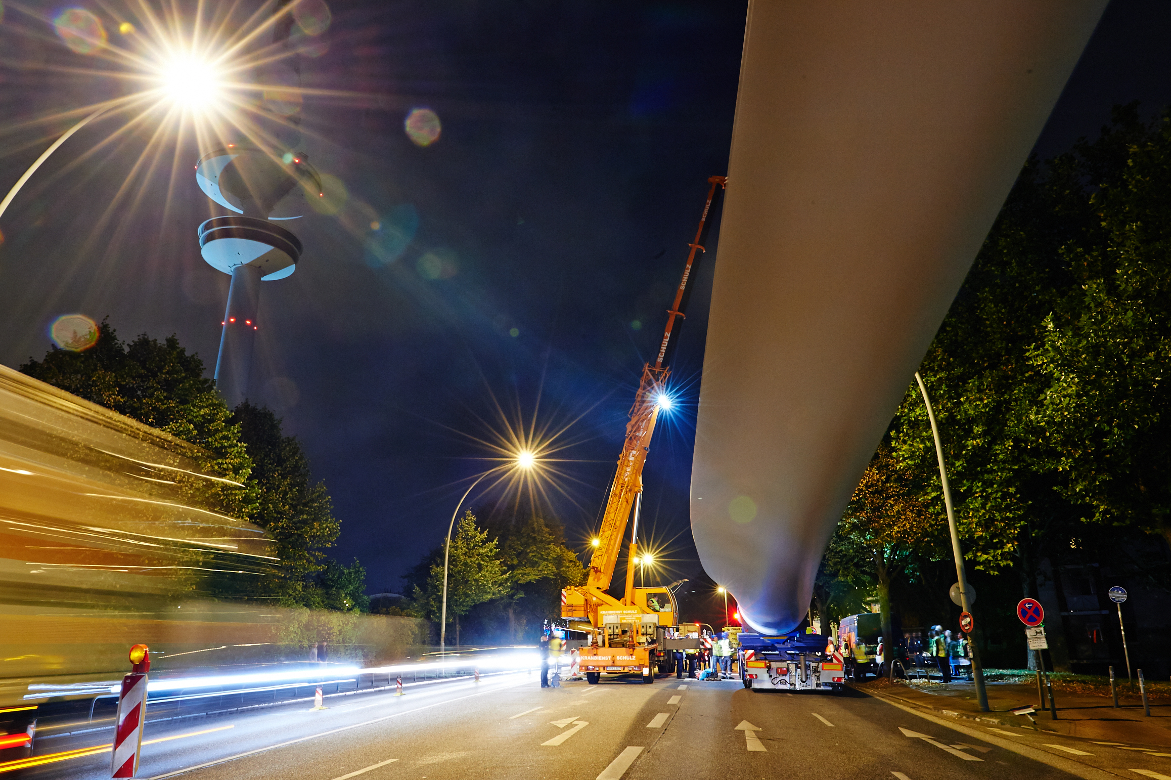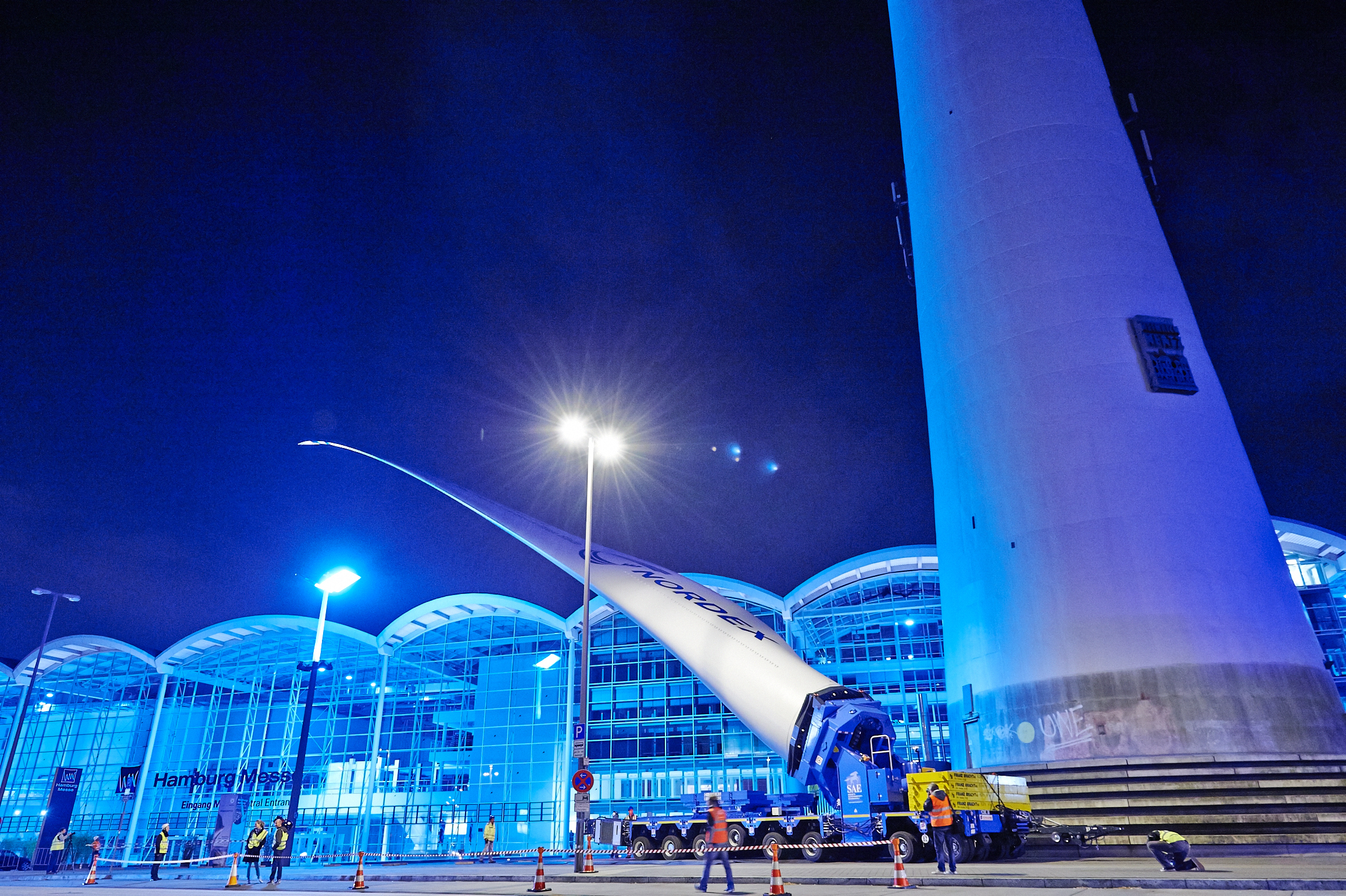 Auf dem Außengelände der Hamburg Messe, direkt neben dem Fernsehturm, können Fachbesucher dabei auch die Leistung der zweiten Generation des Rotorblattadapters der TII Group erleben und so Windenergie- und Logistik-Know-how aus nächster Nähe erfahren: Während der Messetage wird der Rotorblattriese der N131/3000 bei regelmäßigen Vorführungen mit einem Neigungswinkel bis 70 Grad nach oben bewegt.