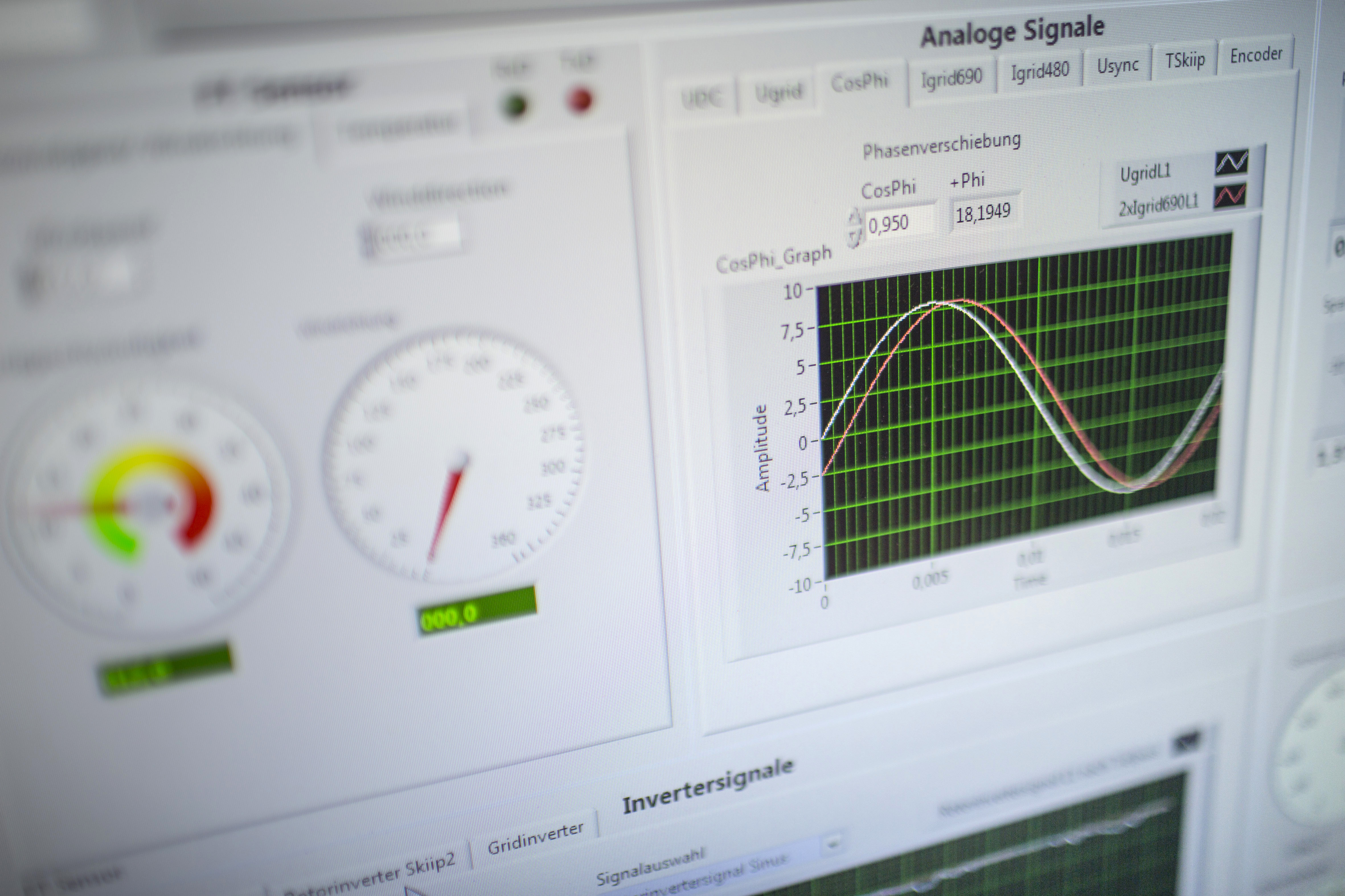 Mit der virtuellen Windenergieanlage prüft die Deutsche Windtechnik die Funktion der reparierten Umrichtersteuerungen und sichert die Qualität der Reparatur: An dem Teststand der Deutschen Windtechnik Steuerung GmbH in Viöl (Schleswig-Holstein) simuliert das System die Umgebungssignale einer realen Windenergieanlage. Dazu zählen neben dem Wind auch die Spannungen und Ströme des Energienetzes. Außerdem generiert die virtuelle Windenergieanlage den Pitchwinkel, die Drehzahl und die Spannungen und Ströme des Generators.