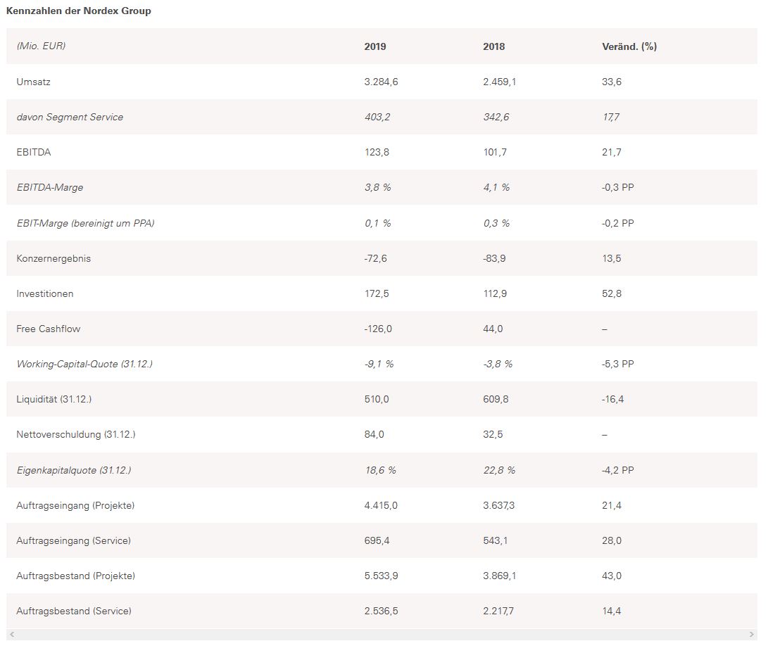 Hamburg (iwr-pressedienst) - Die Nordex Group (ISIN: DE000A0D6554) hat das Jahr 2020 mit einem gut gefüllten Auftragsbuch für neue Windenergieanlagen in Höhe von EUR 5,5 Mrd. begonnen, das somit 43 Prozent über dem Vorjahr lag (2018: EUR 3,9 Mrd.). Vor diesem Hintergrund erwartet das Unternehmen erneut einen deutlichen Anstieg beim Umsatz und ein weiter ansteigendes operatives Ergebnis.