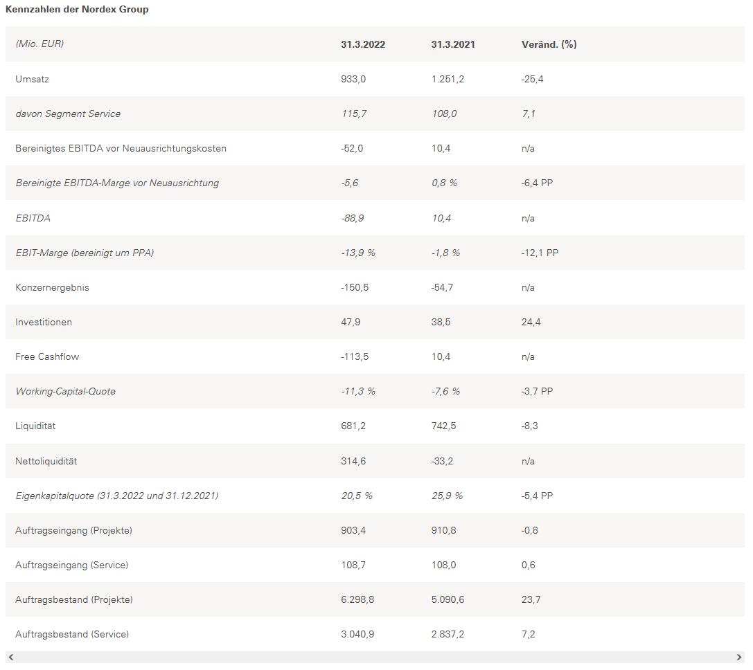 „Der Start in das Jahr 2022 war schwierig und ist sicherlich anders verlaufen als alle erwartet haben. Die Kostensituation bleibt volatil und es kommt zu deutlichen Unterbrechungen der Lieferketten. Dennoch werden die Risiken im operativen Geschäft weiterhin gut ausgesteuert; dabei zeigt sich eine gute Dynamik im Auftragseingang. Dieses geschieht mit einer verbesserten Preisgestaltung, die unsere Margenerholung in Richtung unseres mittelfristigen strategischen Ziels von einer EBITDA-Marge in Höhe von 8 Prozent unterstützen sollte. Der Auftragseingang unterstreicht auch die Wettbewerbsfähigkeit unseres Produktportfolios, welches nun auch die N163/6.X aus der 6-MW-Klasse enthält.“, sagt José Luis Blanco, Vorstandsvorsitzender (CEO) der Nordex Group.