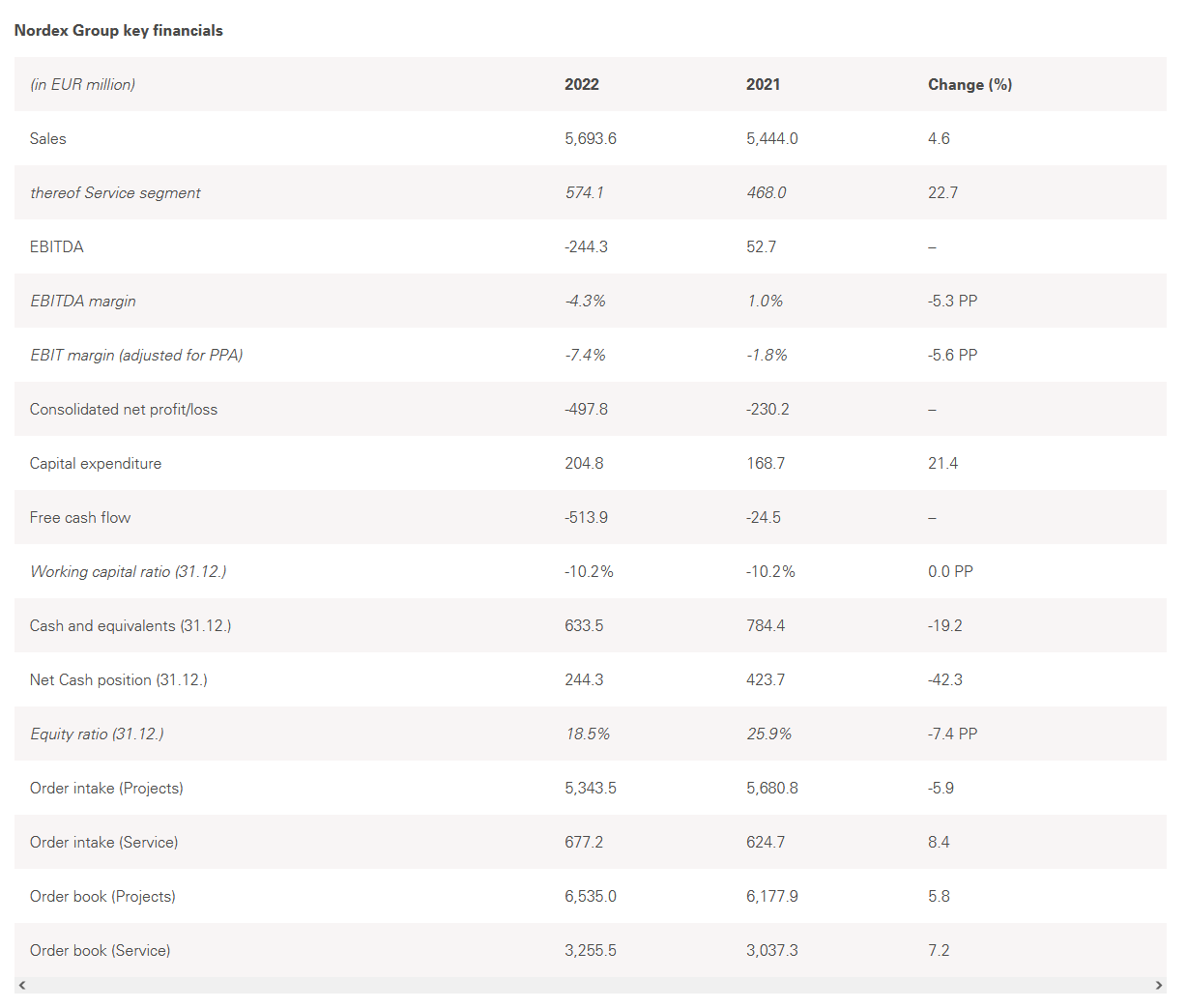 The Nordex Group today published its annual financial statements for 2022, thus confirming the preliminary results published on 9 March 2023. Consolidated sales rose by 4.6 percent to EUR 5.7 billion (2021: EUR 5.4 billion). Earnings before interest, taxes, depreciation, and amortization (EBITDA) amounted to minus EUR 244.3 million (2021: EUR 52.7 million), resulting in a margin of minus 4.3 percent (2021: 1.0 percent). As a result, sales reached the upper end of the most recent forecast range, while after a highly volatile fourth quarter EBITDA was as most recently expected. The working capital ratio as a percentage of consolidated sales was minus 10.2 percent at the end of 2022, again well below the target level of less than minus 7 percent (2021: minus 10.2 percent). Capital expenditure rose to EUR 204.8 million (2021: EUR 168.7 million), exceeding the expected volume of EUR 180 million.